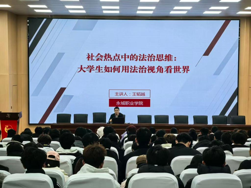 为深入推进法治校园建设,落实秋季学期法治宣传教育月活动要求,2025年12月20日下午三点,永城职业学院保卫处在K205教室成功举办《社会热点中的法治思维:大学生如何用法治视角看世界》专题讲座。我院教师王韬越担任主讲人,200余名在校大学生现场聆听学习,沉浸式感受法治魅力。